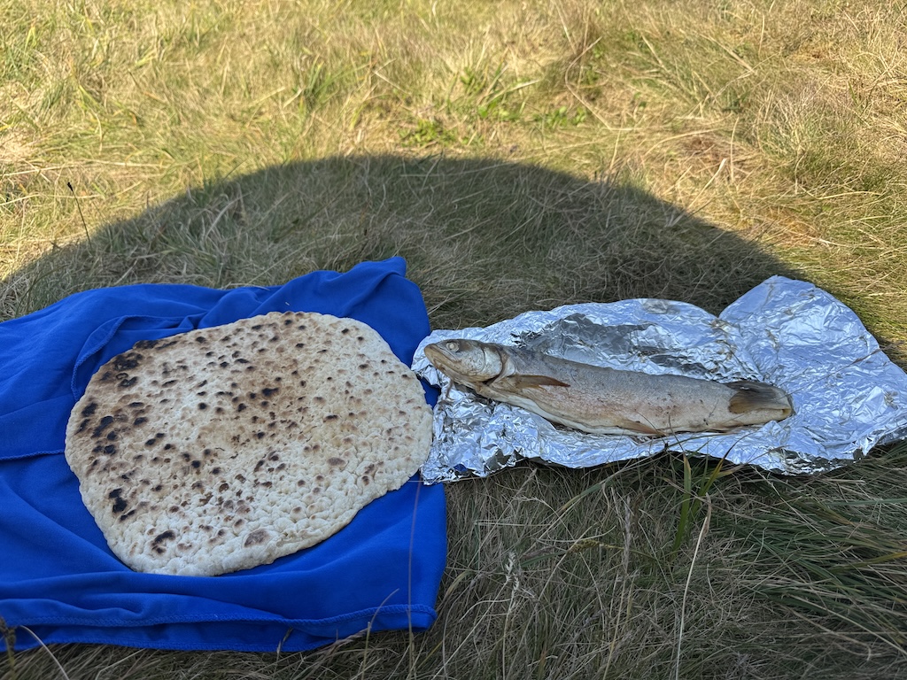 Brot und Fisch in unterschiedlichen samischen Hütten,